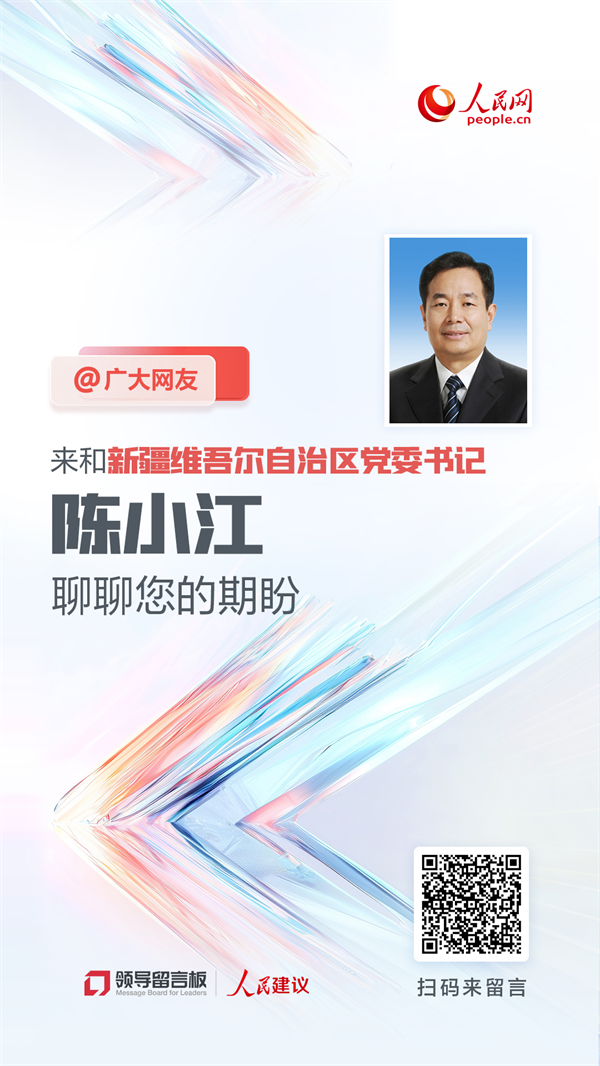 为深入贯彻落实习近平总书记重要讲话重要指示精神,积极探索符合新疆特点的高质量发展路子,10月18日起,人民网“领导留言板”开展“来和新疆维吾尔自治区党委书记陈小江聊聊您的期盼”留言征集活动。您对新疆的建设发展有何建议和期盼?欢迎留下您的“金点子”,为建设社会主义现代化新疆出一份力。