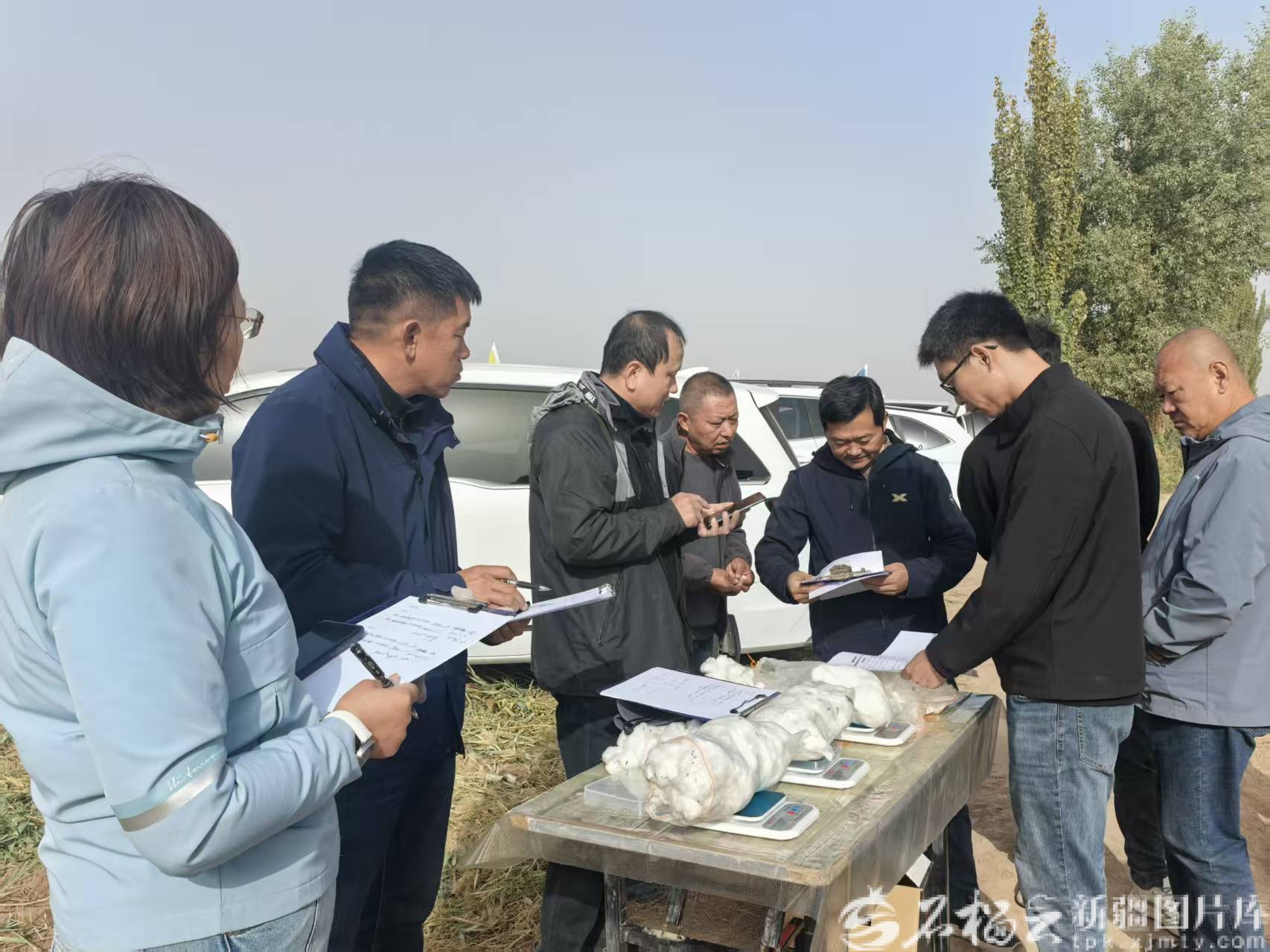 10月18日,在伽师县克孜勒苏乡巴什栏杆村的4000亩高产示范田内,专家组在进行称重、计算。石榴云/新疆日报记者 谢慧变摄
