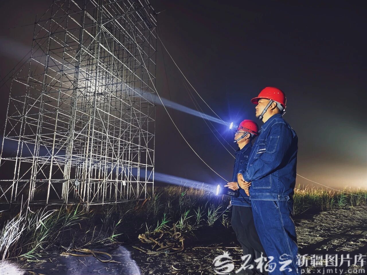 6月12日凌晨,李绍伟(左)与同事检查现场跨越架搭设情况。张灵军 摄