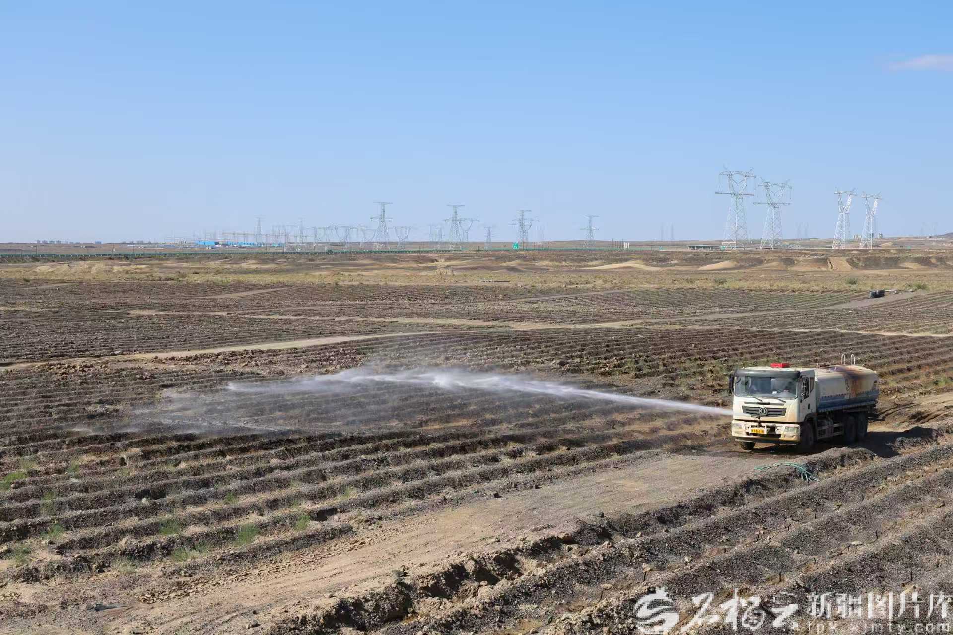 2025年4月,准噶尔盆地西缘(克拉玛依市)历史遗留废弃矿山生态修复示范工程1—4号子项目现场,工作人员在养护浇水。居西坤·亚力坤 摄