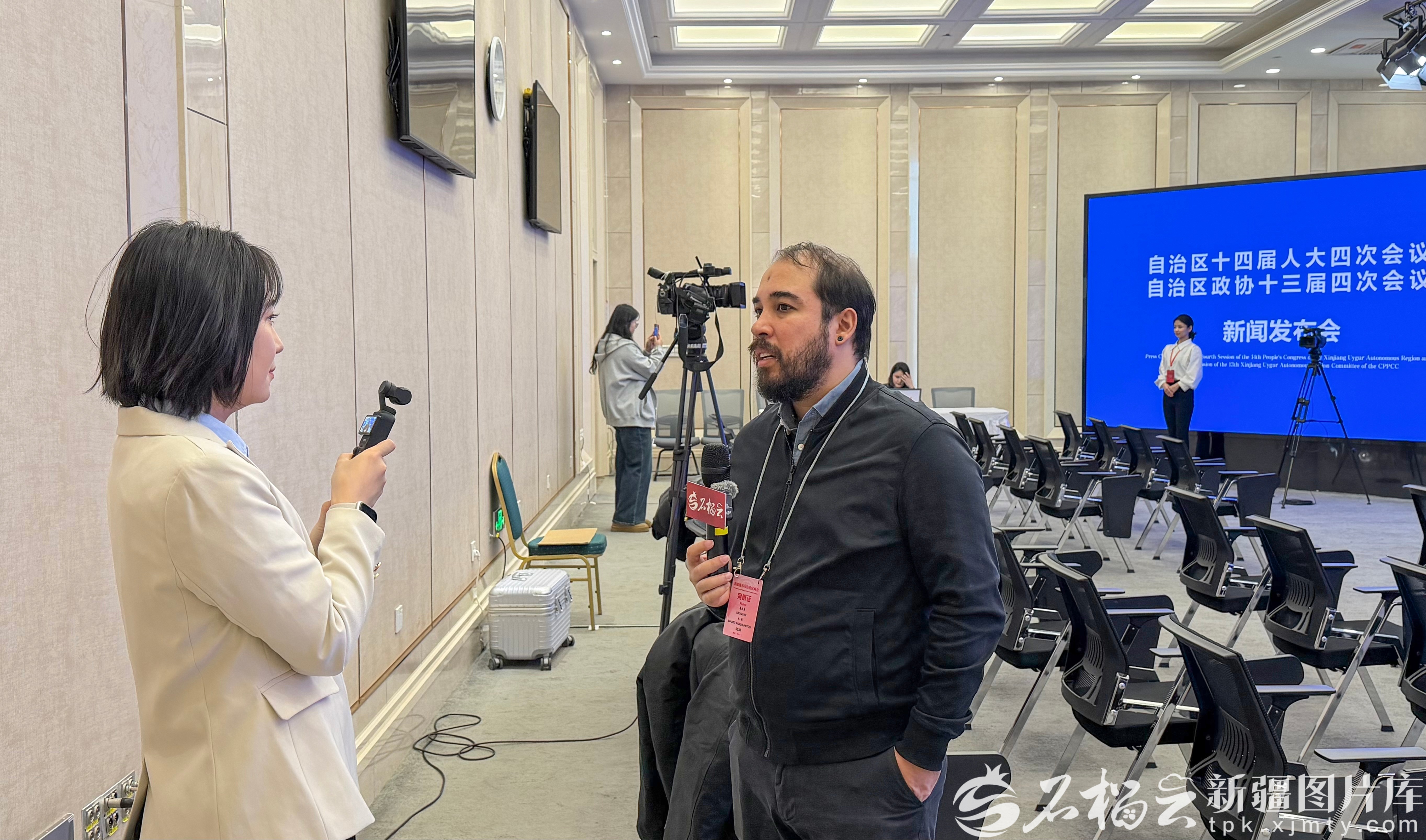 1月26日下午,2026新疆两会第二场新闻发布会在新疆两会新闻中心举行,围绕“依法履职担使命 护航发展谱新篇”作介绍。图为发布会前,境外媒体记者接受石榴云/新疆日报记者采访。石榴云/新疆日报记者 李瑞摄