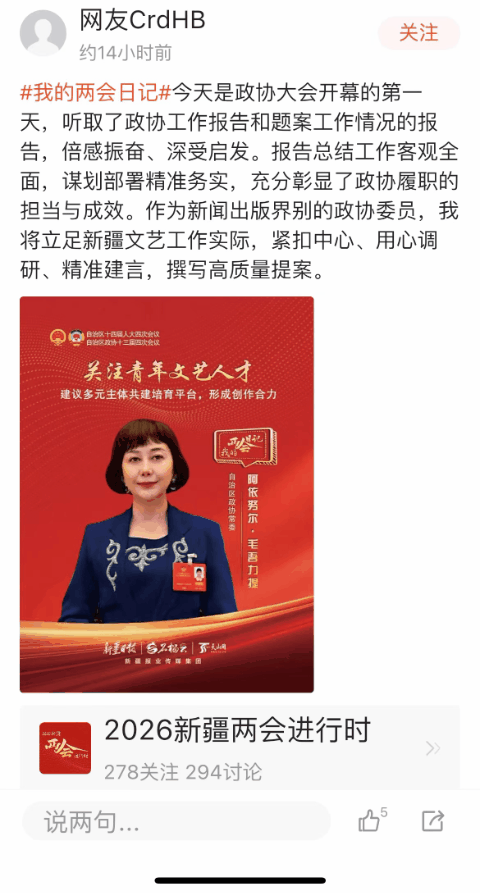 “来到会场,内心澎湃。我将肩负人大代表和电力行业从业者的双重责任立足本职,深入调研,积极建言,为推动新疆电力行业高质量发展贡献力量!”自治区人大代表拉斯荣在#我的两会日记#中分享到。“今年两会我来了,继续为科技强区建设发声,为实现新疆科技强区支撑高质量发展,要加快构建更具活力的创新生态、加快推动我区科技创新和产业创新深度融合,因地制宜发展新质生产力。”自治区政协委员吴顺华在#我的两会日记#中写到。