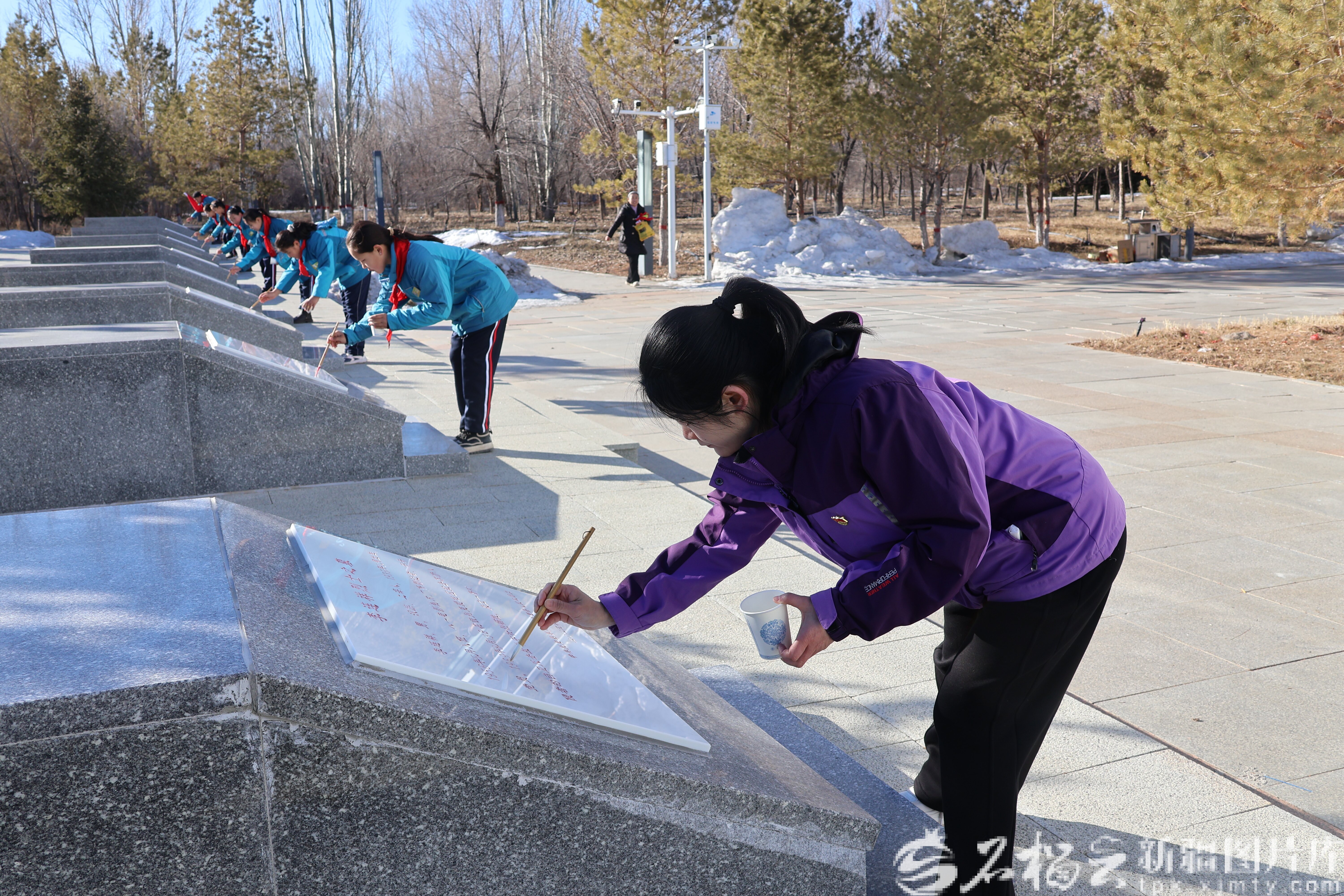 3月25日,托里县第一小学教育集团学生为烈士碑文描红。乔志云 摄